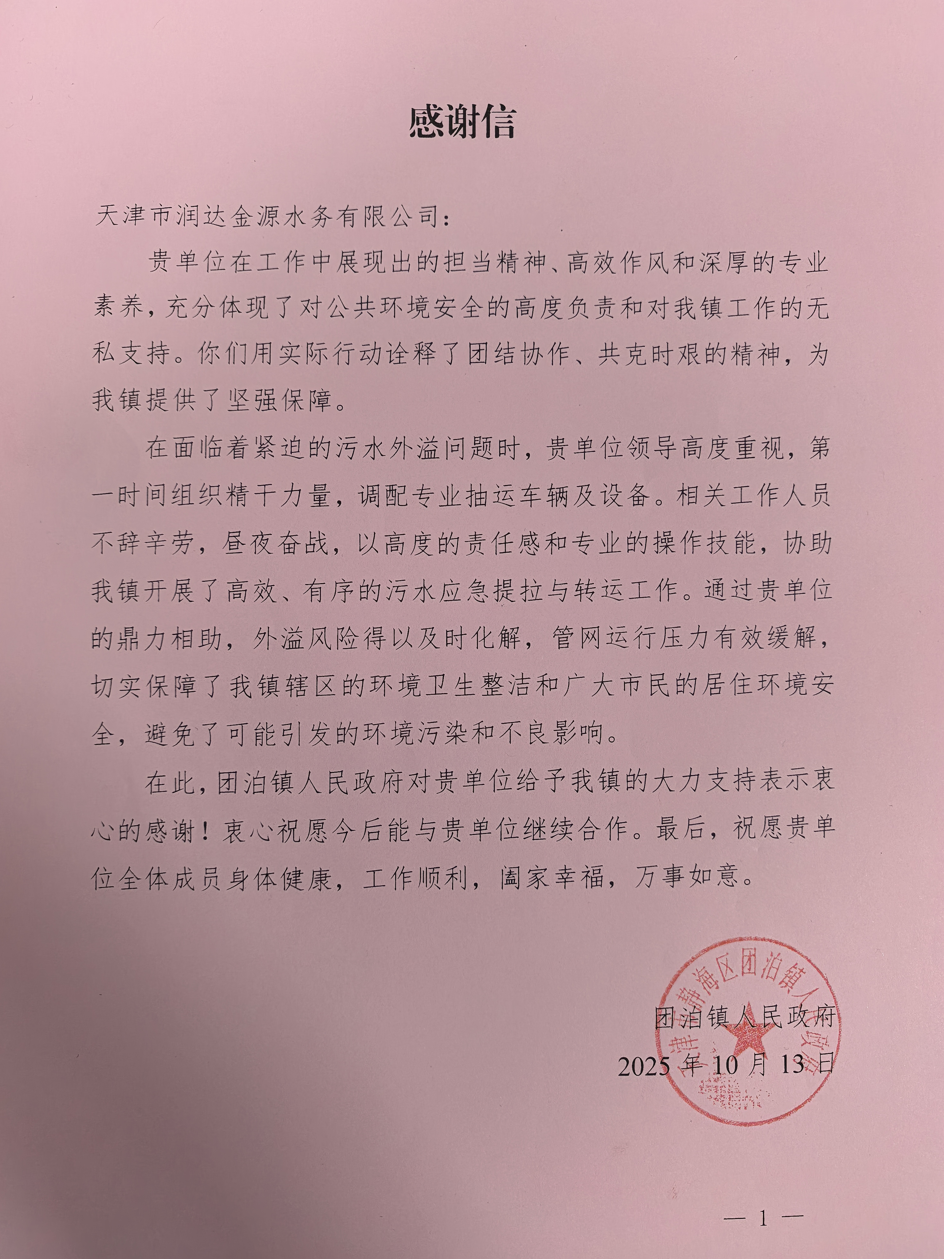 渤海股份所属金源公司在对团泊镇辖区污水外溢情况成功处置不久后,静海区团泊镇人民政府送来感谢信及锦旗,对金源公司在这关键时刻展现出的担当精神、高效作风与深厚专业素养表示感谢,感谢金源公司用实际行动诠释了“团结协作、共克时艰”的深刻内涵,为团泊镇公共环境安全提供了坚强保障。