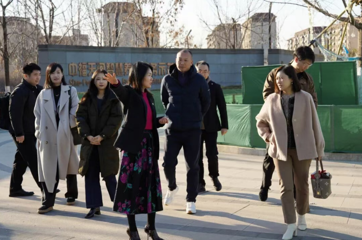 在渤海股份业务总监和中福党支部代表的带领下,新基建与公共事业团队党支部党员代表首先走进中福天河智慧养老服务示范区,沉浸式体验该项目在认知症照护、智慧化服务、场景化运营等方面的专业实力。